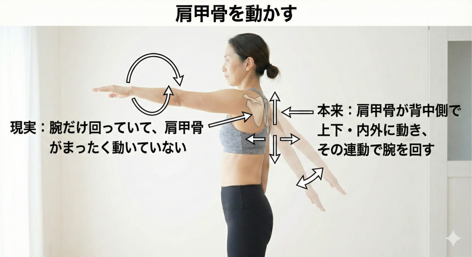 現実:腕だけ回っていて、肩甲骨がまったく動いていない