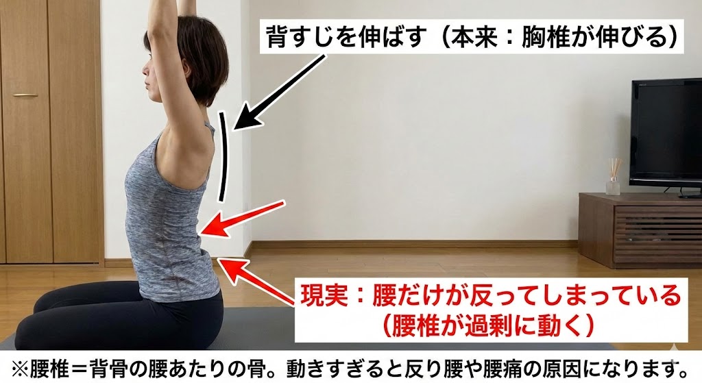 ※腰椎=背骨の腰あたりの骨。動きすぎると反り腰や腰痛の原因になります。